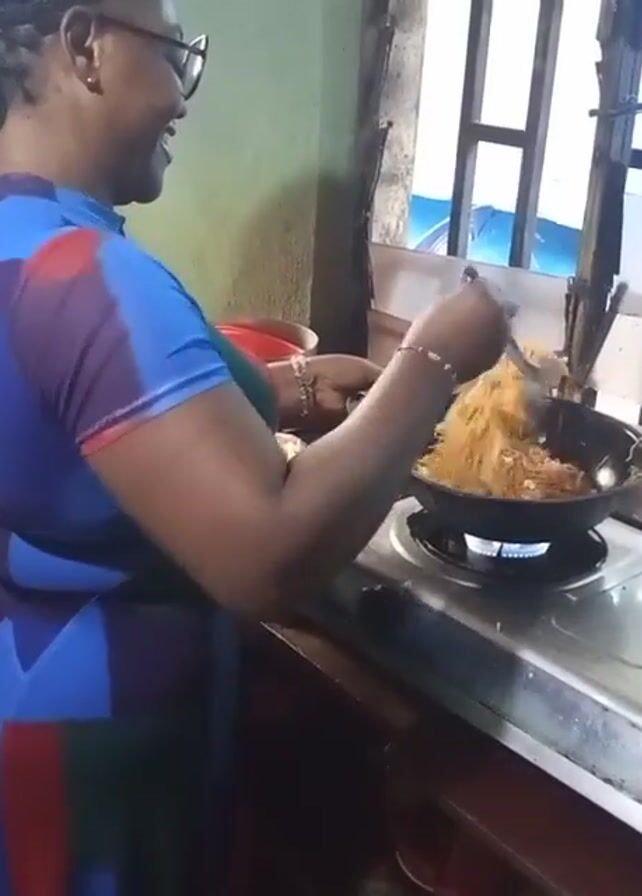 A woman with glasses is seen from the side in a kitchen, smiling and stirring spaghetti in a black pan on a gas stove. She is wearing a colorful dress, and there is a window behind her. The kitchen appears modest.
