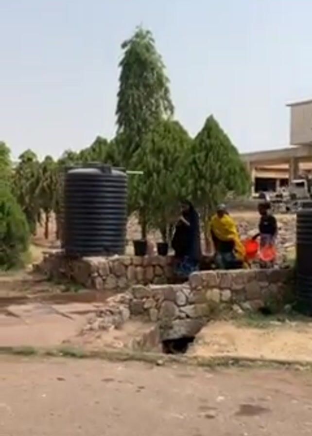 three people filling containers with water from a water source in an outdoor area. One person is wearing a black hijab and a patterned dress, another is wearing a yellow shawl, and the third is wearing a black shirt. They are filling buckets and a black container with water. The water source is surrounded by a stone structure. Two large black water tanks are visible nearby. The area is mostly dirt with some patches of grass. In the background, there is a building with a light-colored exterior and a variety of outdoor furniture items. Several trees of various sizes are present.