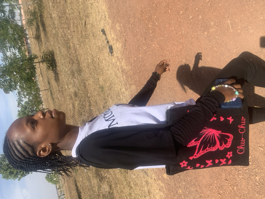 A young woman with braided hair is captured in a full-body shot against a backdrop of dry grass and trees. She wears a white t-shirt, black long sleeve, and black pants. She’s sitting with her legs extended. In her lap, she holds a black tote bag adorned with a pink butterfly and the words "Chu-Chu." A phone with a beaded bracelet is on top of the bag. One arm is extended, and her shadow is visible on the ground. The photograph appears to be taken outdoors on a sunny day.