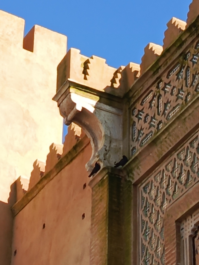 The image displays an architectural detail of a building in Meknes, Morocco, under a clear blue sky. A light ochre-colored wall on the left features a flat crenellated parapet and multiple small, dark, rectangular openings. Adjacent to it on the right is a more elaborately decorated facade, also in shades of ochre and brown, adorned with intricate geometric patterns in dark brown, green, and cream. This ornate facade is topped with a crenellated parapet featuring pointed, tooth-like merlons. A large, carved stone corbel, light in color and exhibiting signs of weathering, projects outward from the upper corner where the two architectural sections converge. Two dark-feathered birds are perched on the narrow ledge directly beneath the corbel and along the top edge of the decorated facade. The scene is illuminated by strong sunlight, casting distinct shadows from the crenellations and the corbel onto the building surfaces.