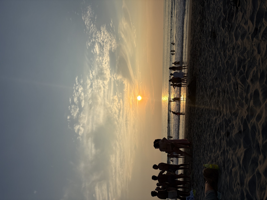 A beach scene at sunset. The sun is a bright orb on the horizon, reflecting on the water. Silhouettes of people stand along the shoreline, some gathered in groups, others wading in the shallow surf. The sky is a mix of light blue and yellow with scattered clouds. The sand is dark, its texture visible in the foreground.