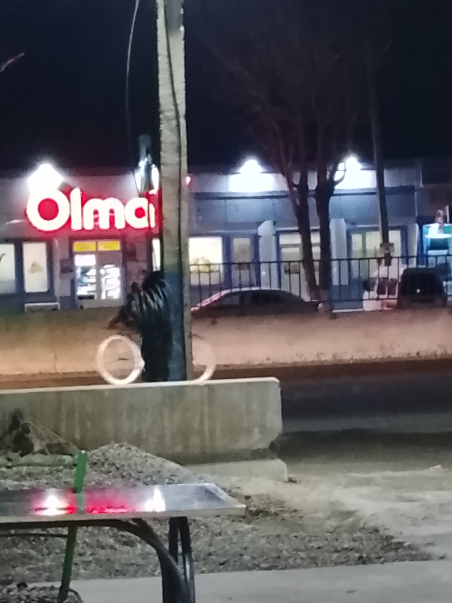 This nighttime image captures an urban street scene in Syrdarya, Uzbekistan. In the immediate foreground, a reflective, rectangular table, possibly metal, displays two distinct red light reflections on its surface. The table has dark legs, one of which appears green-painted. The ground surrounding the table is unpaved, consisting of dirt and scattered debris. A light-colored concrete barrier runs horizontally across the lower half of the frame, separating the foreground from the street. In the midground, behind the concrete barrier, a dark-clad individual is seen on a bicycle. The person's body is largely obscured by a prominent dark utility pole or tree trunk situated centrally. The bicycle's front and rear wheels are distinctly illuminated in white, suggesting either reflective elements or motion blur. Beyond the concrete barrier, a dark, paved road surface is visible, upon which a dark sedan-like vehicle is partially discernible. The background consists of commercial buildings illuminated by artificial light. On the left, a building features a large, bright red and white neon sign displaying "Olmai," indicating a store or supermarket. Its interior is lit, showing merchandise through windows. To the right of the "Olmai" building, another structure with a blue-grey facade is visible, featuring multiple lighted windows and doors, partially obscured by bare, leafless trees and a black metal fence or railing. The overall environment is dark, with artificial lights providing illumination to specific areas.