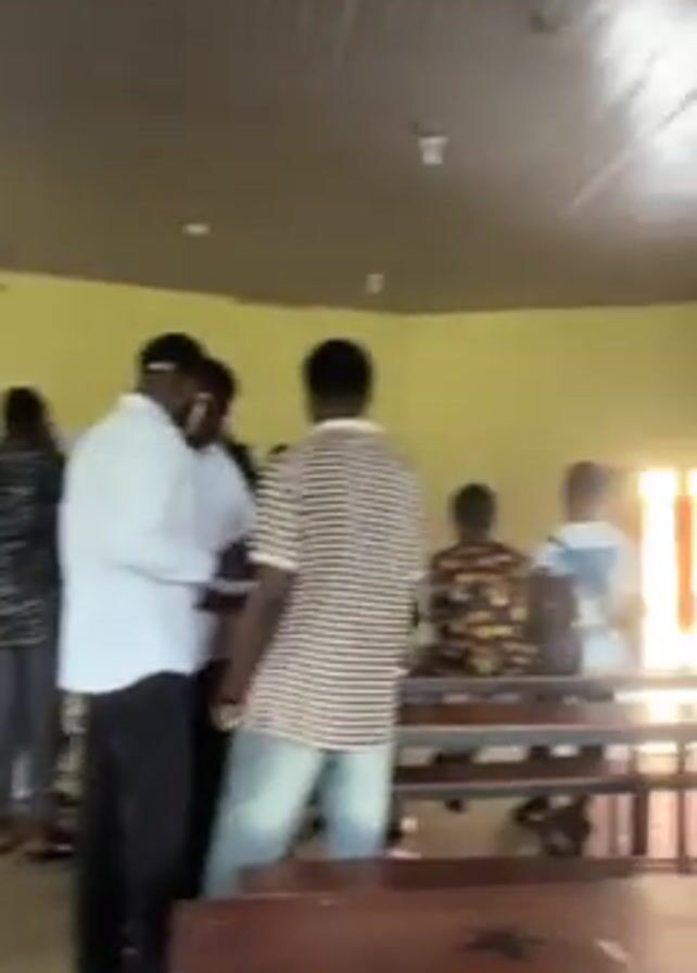 group of young men in a classroom. Some are standing, while others are sitting at desks. The room has yellow walls and a metal ceiling. There is a window letting in light. The students appear to be engaged in conversation and studying.