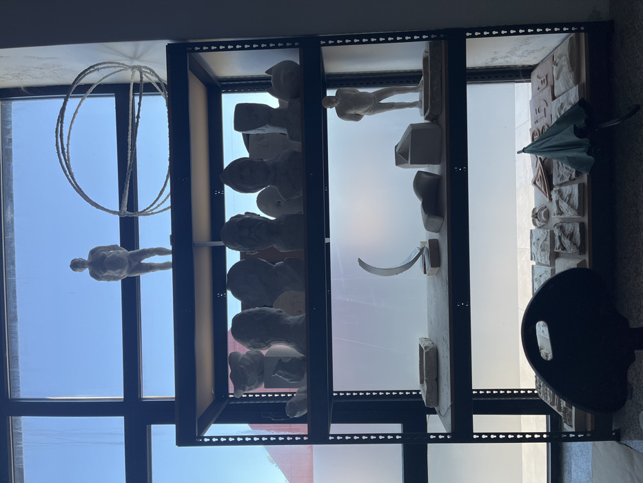 The image depicts an interior scene, likely an art studio or storage area, in Cetinje, Montenegro. A multi-tiered, black metal shelving unit occupies the central frame, positioned against a large window that reveals a clear blue sky. Above the uppermost shelf of the unit, a light-colored, full-body sculpture of a stout male figure stands directly in front of the window pane. To its right, a large, intricate circular sculpture, possibly made of wire or textured material, is positioned against the window. The top visible shelf of the shelving unit holds approximately ten light-colored sculptures, primarily busts or head models of varying sizes and styles. One distinct cat-like head sculpture is visible on the far right of this shelf. The middle shelf displays several light-colored sculptures, including a standing full-body male figure on the right, a crescent-shaped abstract sculpture on a wooden base, a rectangular tray, and several other abstract forms. The bottom visible shelf contains numerous rectangular relief sculptures or molds, depicting faces, textured surfaces, and geometric patterns. A dark green, folded umbrella lies horizontally on this shelf, on the right side. Partially visible in the lower-left foreground is the dark backrest of a chair or stool. The lower section of the background window appears to have a frosted or translucent film, obscuring any exterior ground-level details.