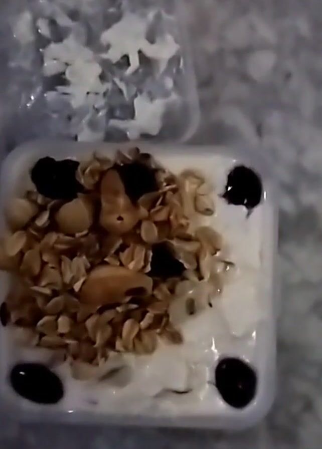 - "A close-up overhead shot shows a small, square, clear plastic container holding a white, creamy substance, likely yogurt, topped with a pile of granola, scattered raisins, and several cashews" by FM-xUrmj1, licensed under CC BY 4.0