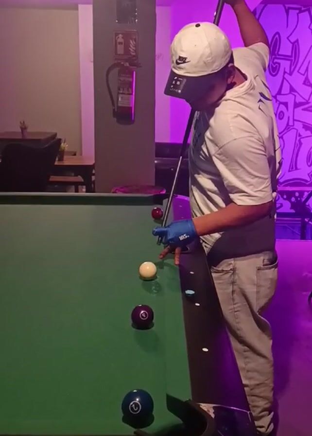 - "A person wearing a white Nike baseball cap, a white t-shirt, blue gloves, and light gray pants stands by a pool table, holding a pool cue above their head" by FM-GD3tL2, licensed under CC BY 4.0