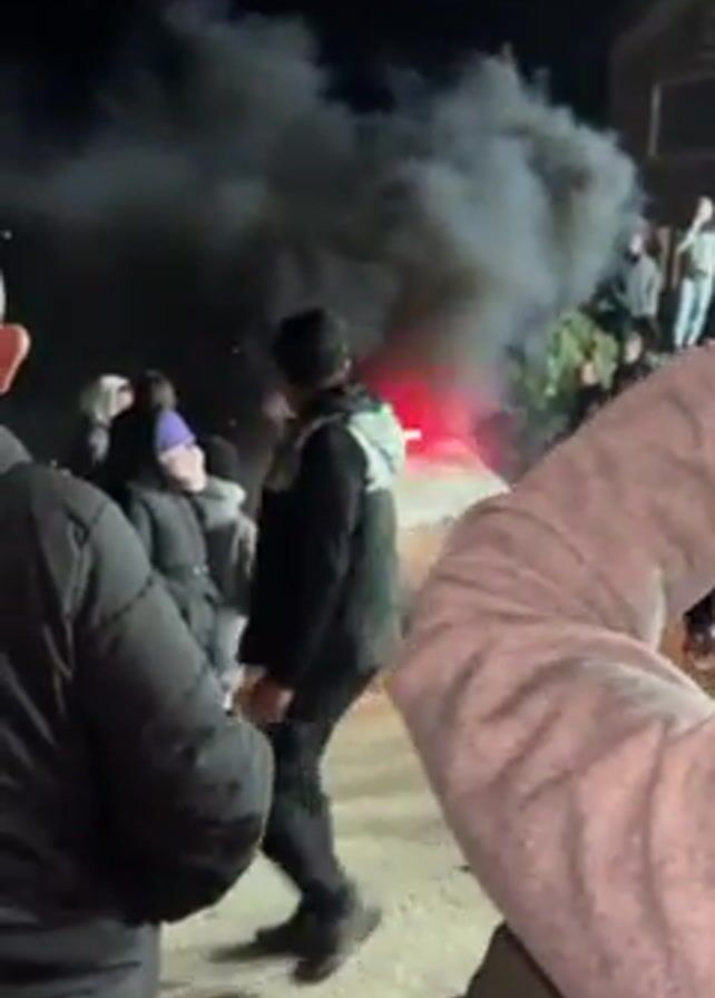 crowd of people standing at night, watching a vehicle that is emitting a large amount of black smoke. The vehicle’s headlights and emergency lights are visible. Some members of the crowd are wearing winter clothing like jackets and hats. The general atmosphere appears chaotic due to the smoke and the emergency vehicle. The environment is dark, suggesting that the video was taken at night. There are buildings visible in the background.