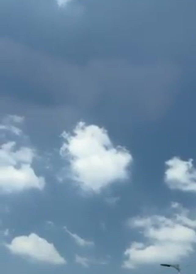 sky with white clouds moving. The sky is blue with some darker patches. Two streetlights are visible in the bottom right corner. The camera seems to be moving slightly.