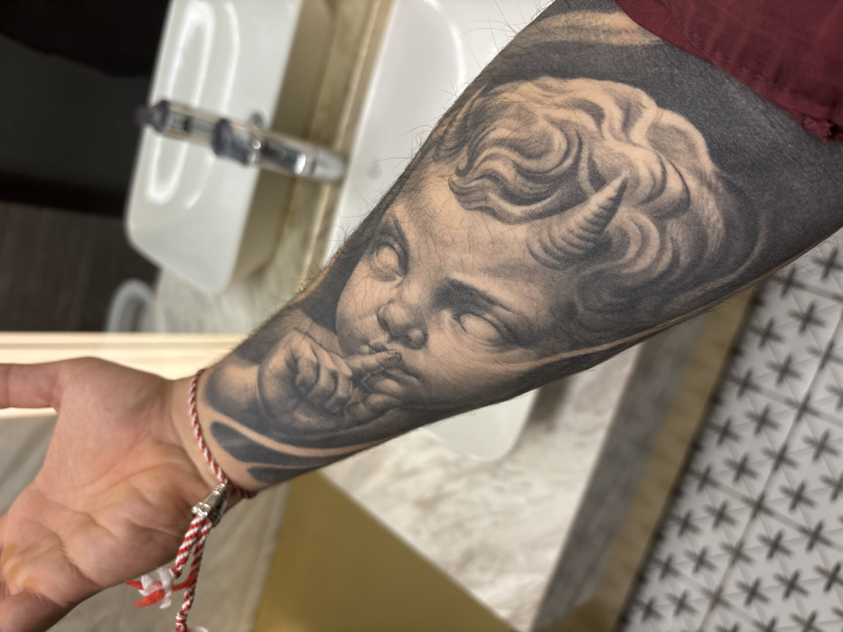 A close-up image displays a person's left forearm, heavily tattooed in black and grey, positioned above a bathroom sink in Varna, Bulgaria. The tattoo on the forearm depicts a classical-style face with closed eyes and intricate swirling details, situated beneath a baby's hand gently touching its forehead. A red and white braided Martenitsa bracelet, secured by a metallic clasp, is visible on the wrist. A dark red shirt sleeve partially covers the lower right portion of the arm. The background features a white rectangular ceramic sink with a metallic faucet, resting on a light-colored, patterned countertop. Below the forearm, light-colored square floor tiles with a dark cross-hatched pattern are visible.