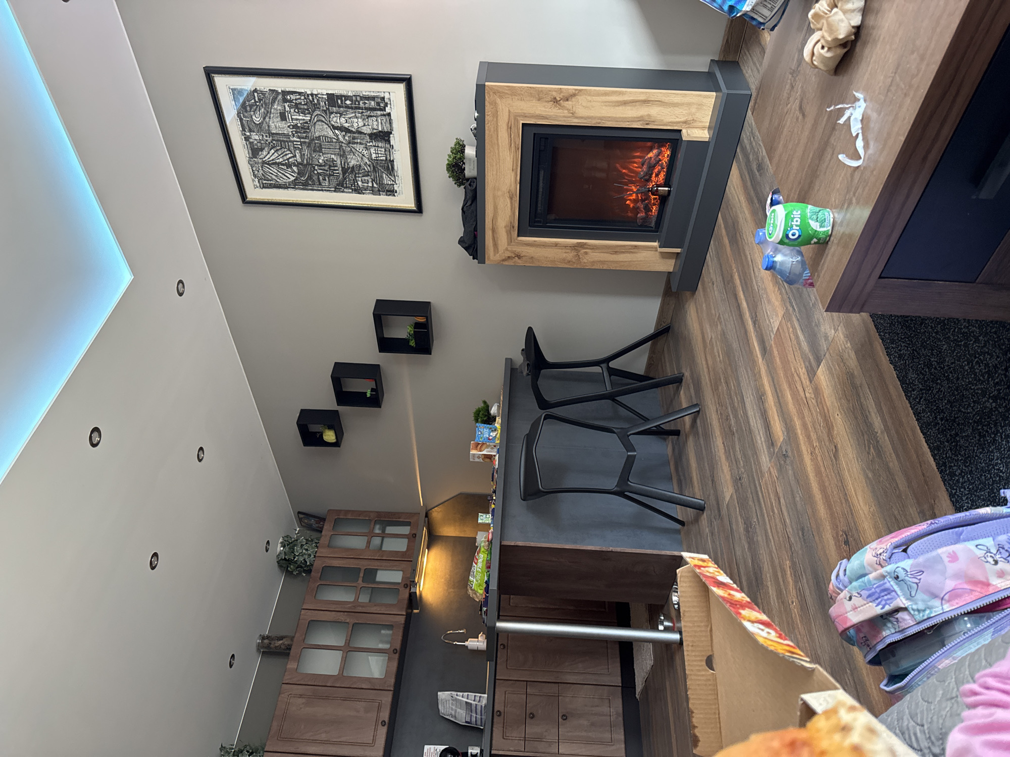 This image presents an interior view of a modern apartment located in Samokov, Bulgaria. The scene captures an open-plan living space encompassing a kitchen and a lounge area. The kitchen segment on the left features dark wood cabinetry with both solid and glass-fronted upper units, dark gray countertops, and a matching backsplash. A silver-toned sink and faucet are visible, along with a black coffee maker and under-cabinet lighting illuminating various items on the counter, including plastic bags, boxed food items, and small potted plants. A dark gray island counter extends into the room, serving as a breakfast bar with two black, modern-style bar stools. On the floor beneath the island, two small metal bowls are present. The living area features light gray walls and wood laminate flooring. The white ceiling is equipped with multiple recessed spotlights and a perimeter blue LED strip light. A large framed black and white artwork, depicting an intricate urban or fantastical scene, hangs centrally on the far wall. Beneath it stands an electric fireplace with a light wood-toned mantel surround and a dark gray base, displaying simulated flames. A small potted plant and a dark fabric item are placed on the fireplace mantel. To the left of the artwork, three black square wall shelves are mounted, each holding minimal decorative objects. In the foreground, an open cardboard pizza box is positioned on a surface, likely a sofa. Adjacent to it on the floor is a colorful child's backpack adorned with various cartoon characters. A low, dark wood coffee table is visible in the lower right, holding two plastic water bottles, a green container of Orbit chewing gum, a crumpled white chewing gum wrapper, and a light-colored scrunchie. A partial view of a person, identifiable by a pink garment, is visible in the extreme lower-left corner, largely obscured by the pizza box and backpack. No complete individuals are visible in the scene.
