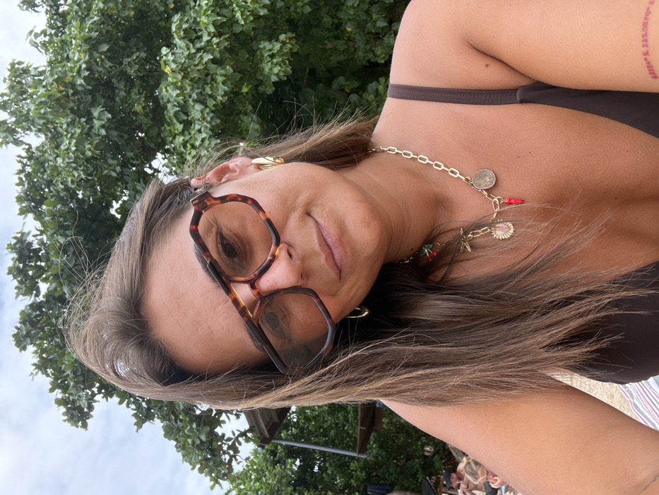 A woman poses outdoors with green foliage. She has long, brown hair and is wearing tortoise-shell glasses. A gold necklace with charms adorns her neck, and she appears to be wearing a brown swimsuit. Part of a tattoo is visible on her arm. The photo is taken at an angle, with a portion of the sky also visible.