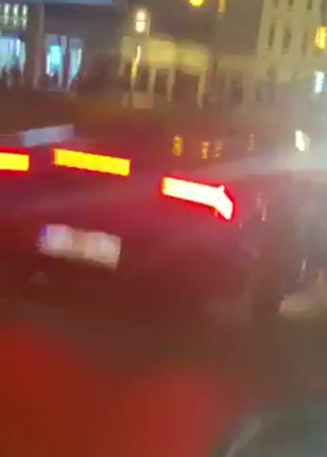 A person on a motorcycle is filming a blue Lamborghini Huracán Evo Spyder at night. The Lamborghini has a Belgian license plate that reads “2-GBW-523.” The camera is mounted near the right indicator of the motorcycle. A circular mirror is visible on the right. The car is stopped at an intersection. The environment is a city at night with streetlights and lighted buildings. A large digital billboard is in the background. The weather is windy.