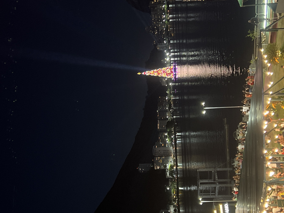 A brightly lit Christmas tree stands tall in the center of a dark body of water, reflecting in the lake. The scene is at night with city lights visible on the opposite shore, also mirrored in the water. A beam of light shines directly up from the top of the tree. People are gathered along the right side of the frame, seemingly watching the display. Decorations and lights are also present along the right edge of the frame.