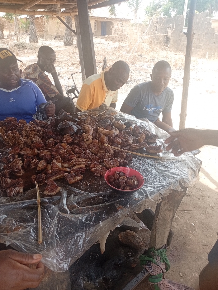 group of four men gathered around a table piled high with a large quantity of grilled meat. The men are seated in a partially covered outdoor setting, with a thatched roof overhead, constructed from a wooden frame and supported by wooden poles. The table is covered in a plastic sheet, on which sits an abundance of grilled meat, likely pork. The meat is arranged on the table in a haphazard manner, with some pieces neatly stacked and others spread out in a more casual fashion. A red bowl filled with additional pieces of meat rests on the table. The men are dressed in various casual attire. Two of the men are wearing shirts with logos on them, while one man is wearing a white shirt and another man is wearing a blue shirt. The men appear to be enjoying the meal together, as evidenced by the fact that they are all looking at the food and engaging in conversation with each other. The environment is relaxed and convivial, with the men seeming to be enjoying the meal and each other's company. The location is Assai Sabongida, Nigeria, based on the latitude 8.864 and longitude 8.442.