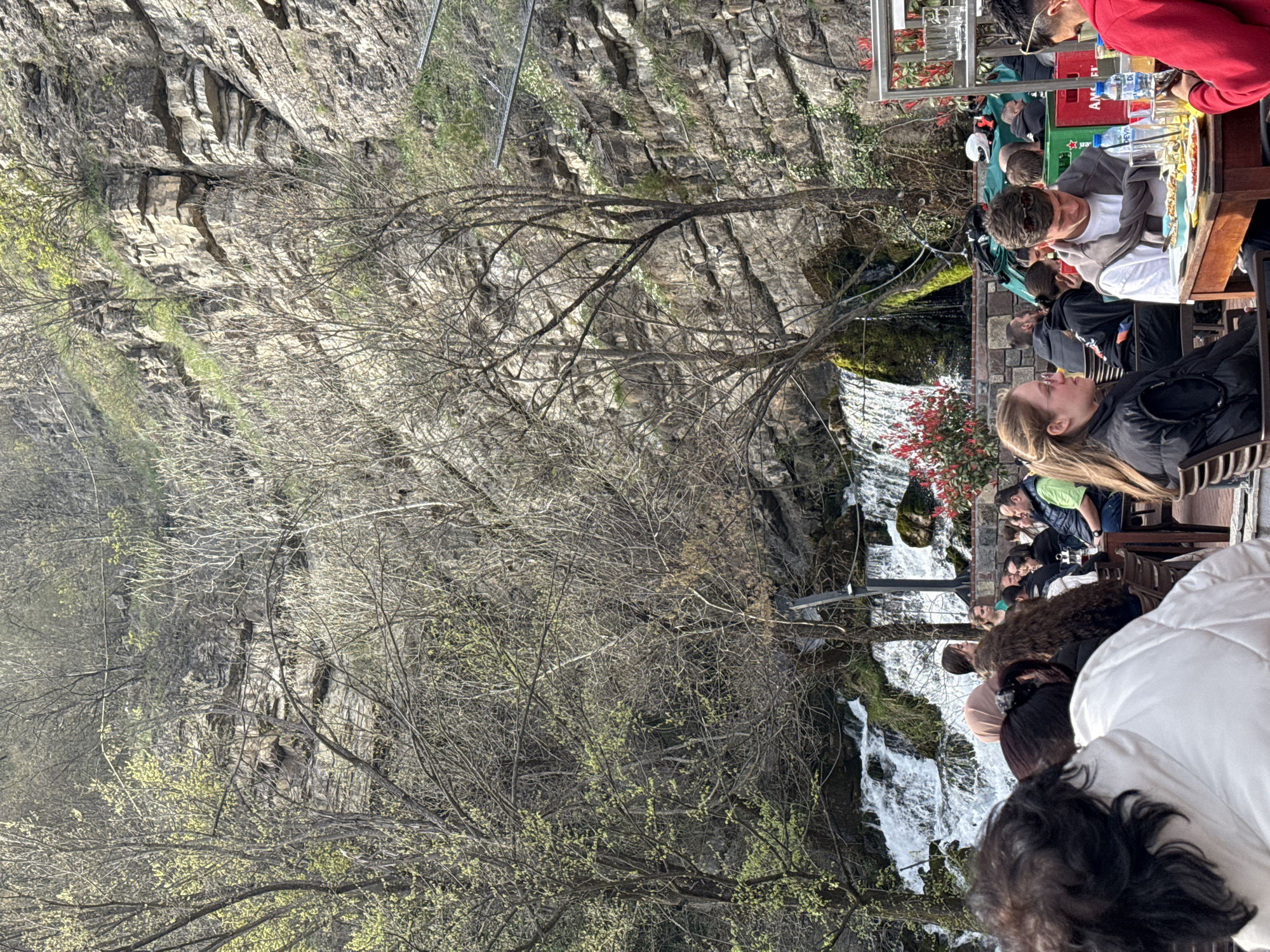 A group of people are seated at tables outside a restaurant or cafe next to a waterfall. The scene is Milanovo, Bulgaria, as evidenced by the waterfall, which is a local attraction. The waterfall cascades down a rocky cliff face. Bare trees and some with early spring foliage are in the foreground and along the side of the cliff. Some of the people are eating and drinking, while others appear to be talking and observing the waterfall. There are bottles of water and other drinks on the tables. One table has a red container that possibly holds drinks. The people are dressed in casual attire, including jackets and sweaters. The general atmosphere appears relaxed and social.