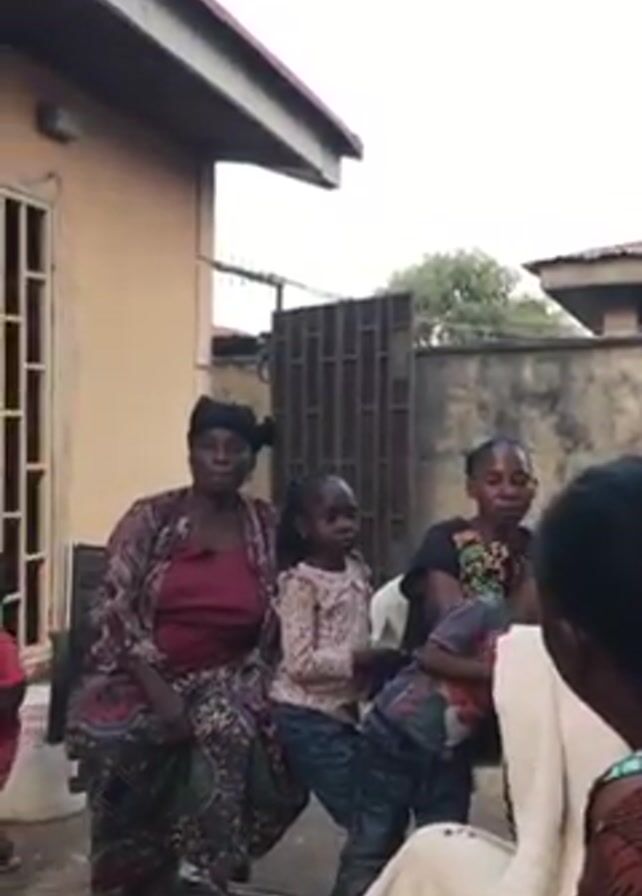 group of people gathered outside, possibly in a courtyard or backyard. Five adults and three children are visible. One adult is seated in a chair, facing the camera. Another woman is standing behind her, drying her hair with a white towel. To the left, a woman in a floral print outfit sits next to two young girls. Another woman stands next to them with a young boy. The background includes parts of buildings and a metal gate. The overall setting appears to be a casual outdoor gathering.