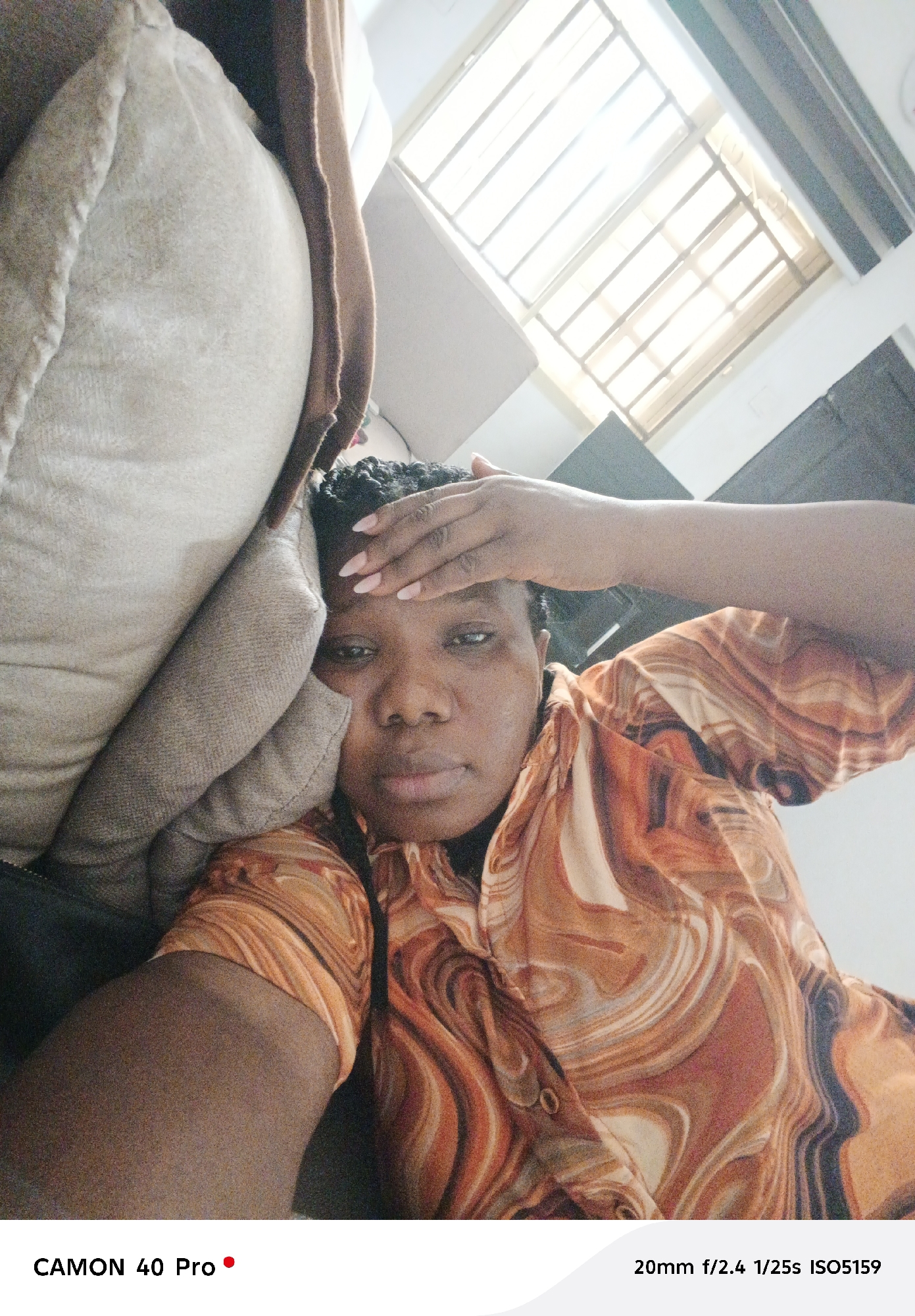 A woman is lying on a couch in a room with a window. She is wearing an orange and brown shirt. She is looking at the camera with her hand on her forehead. The location is Unknown, Unknown.