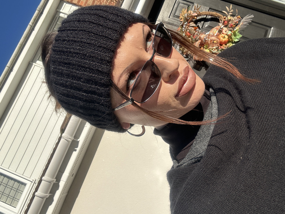A close-up outdoor portrait captures a female individual in Tunbridge Wells, United Kingdom, illuminated by direct sunlight under a clear blue sky. She wears a black knitted beanie, narrow dark rectangular sunglasses with silver frames, and large silver hoop earrings. Her attire consists of a black roll-neck sweater layered over a grey garment. Strands of light brown hair frame her face, and her lips are full with a light, neutral tone. Her gaze is directed upwards and to the right. The background features a light-colored building facade with a white window and venetian blinds visible in the upper left, beneath a white plastic gutter and downspout. A dark front door, partially visible to the right, is adorned with an autumnal wreath comprising oranges, reds, and brown elements.