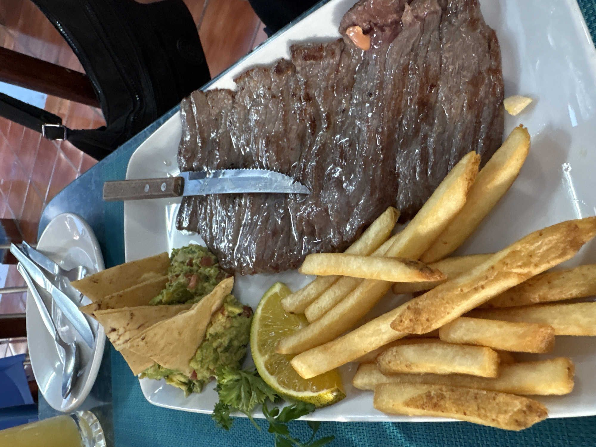 A high-angle, medium shot presents a white rectangular plate laden with food, including grilled steak, French fries, guacamole, tortilla chips, and a lime wedge. A serrated knife rests on the steak. To the left of the plate, a stack of silverware sits on a small white plate. In the background, a black bag hangs on a wooden chair. The photograph appears to have been taken in Tejalpa, Mexico, based on the information provided.