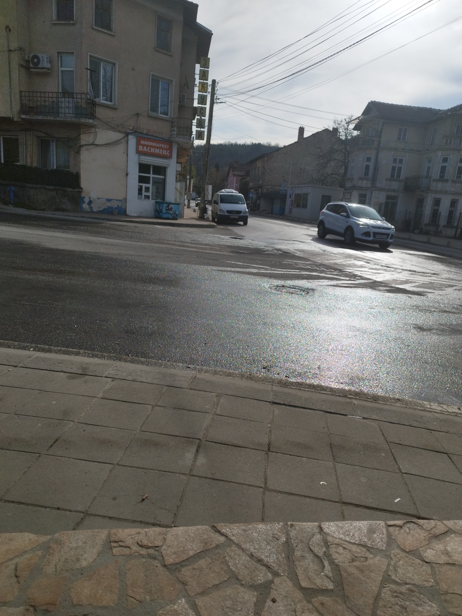The image depicts a street scene in Momin Prohod, Bulgaria. The road surface is wet, reflecting sunlight. A white Ford Escape is driving on the road, and a white van is parked further up the street. On the left side of the image, a building with a "МИНИМАРКЕТ ВАСИМЕКС" sign is visible. A three-story building is adjacent to the market, with a decorative iron balcony on the second floor. On the right, another building with similar architecture is seen. A pedestrian sidewalk is in the foreground, constructed from stone and concrete. Power lines are visible overhead. In the distance, hills are seen.