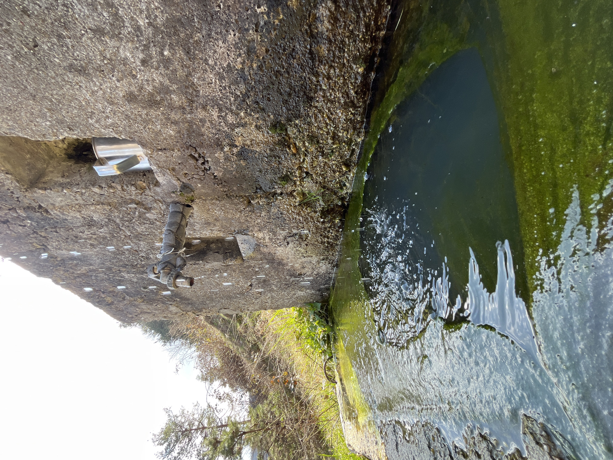 This image captures a weathered, functional public water source in Srednogortsi, Bulgaria. A roughly hewn, textured concrete or stone wall forms the central structure, from which a galvanized metal pipe extends horizontally, terminating in a spigot that drips water into a concrete basin below. White, vertical streaks, consistent with mineral deposits or remnants of ice, are visible on the wall above the pipe. A polished metallic cup or small pitcher is lodged within a rectangular niche carved into the wall, positioned above and to the right of the spigot. The concrete basin is filled with dark green water, indicating significant algal growth on its submerged surfaces, and the dripping water creates concentric ripples and aeration on the surface. Behind the wall and to the left, sparse vegetation includes tall, dry grasses, bare deciduous shrubs, and several evergreen pine trees under a bright, possibly hazy sky.