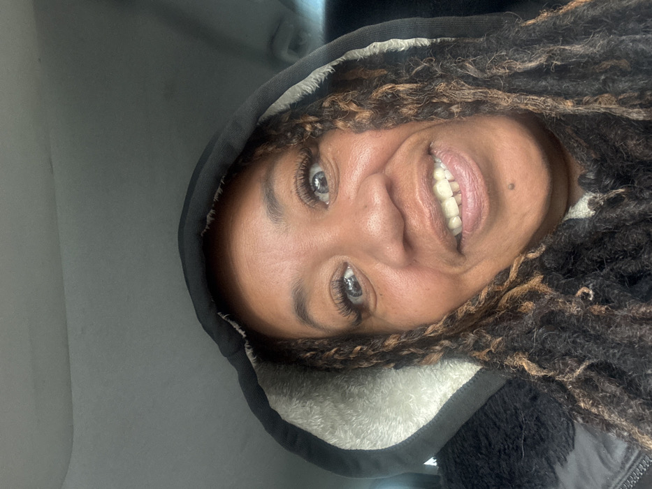 A single female individual is depicted in a close-up, chest-up portrait, stated to be located in Oberhausbergen, France. The subject has brown skin and dark dreadlocked hair with light brown highlights, visible around her face and shoulders. Her eyes are light blue-grey, and she has prominent eyelashes. She is smiling broadly, revealing her upper teeth, and looking directly at the camera. She wears a dark, possibly black, hooded jacket or coat with a visible light-colored, likely cream or white, sherpa or fleece lining inside the hood. The background consists of a plain, light grey surface, consistent with the interior headliner of a vehicle. No external environment is visible.