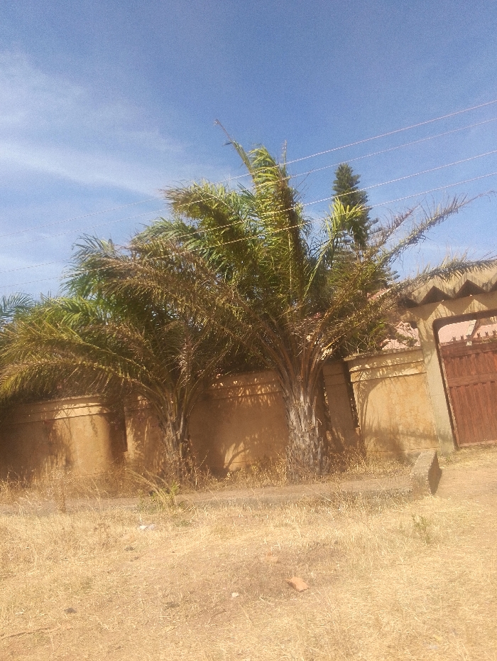 The image captures an outdoor scene in Jos, Nigeria, under a clear blue sky with faint cirrus clouds. The foreground shows dry, light brown soil covered sparsely with withered, yellowish grass and scattered small debris, including a piece of reddish-brown brick. In the midground, a low, ochre-colored perimeter wall runs horizontally, topped with decorative coping and featuring vertical pilasters. Several palm trees with both green and browning fronds are situated along this wall, casting distinct shadows. A taller, slender tree with dense green foliage is visible behind the central group of palm trees. To the right, a brown wooden gate is set into the perimeter wall. Multiple thin utility lines are visible horizontally across the upper portion of the sky. No individuals or specific activities are depicted.