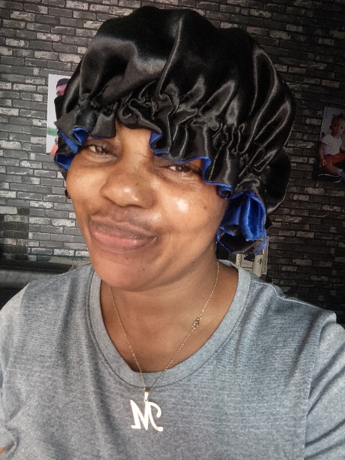An adult female is depicted in a close-up, chest-up shot within an indoor setting, indicated to be in the city of Warri, Nigeria. She has dark skin, is smiling with her lips closed, and is looking directly at the camera. She wears a black satin sleep bonnet with a blue inner lining, which appears gathered around her forehead. Her attire consists of a grey, short-sleeved t-shirt and a gold-colored chain necklace featuring a large pendant with stylized initials, possibly "MP" or "MC". A smaller, less distinct gold-colored charm is also visible higher up on the chain. The background features a dark grey brick-patterned wallpaper. On the wall to her left, a partially visible poster shows a person's image. To her right, another poster displays a young child, possibly a toddler, seated and wearing red clothing. The lighting suggests an artificial indoor source.