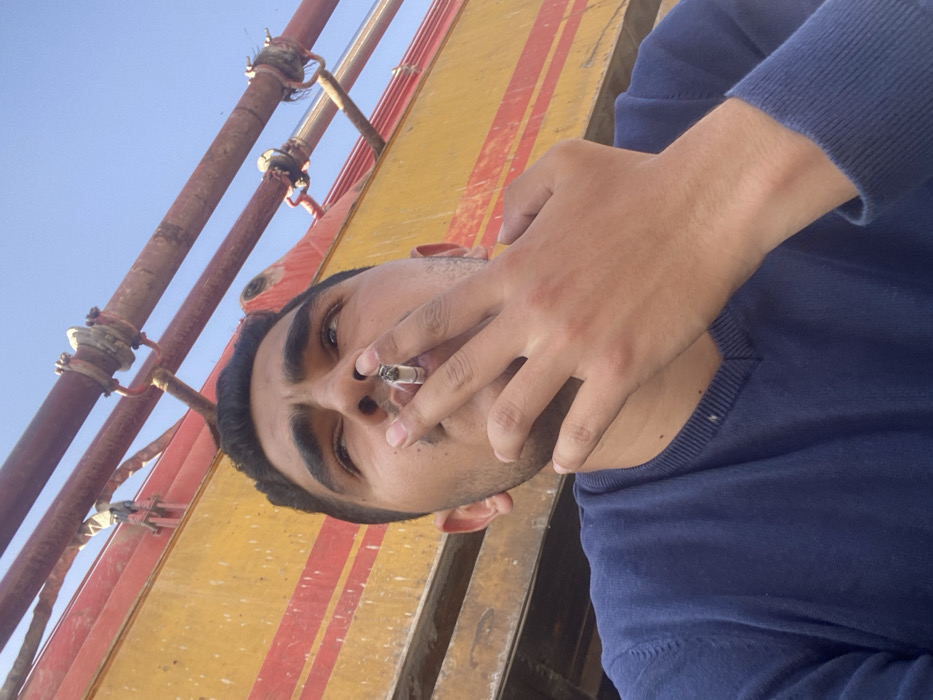 In Dahiyat Harasta, Syria, a young adult male is depicted in an outdoor setting. The subject, with dark hair and facial stubble, wears a dark blue V-neck long-sleeved shirt. He holds a lit cigarette with visible ash between the index and middle fingers of his left hand, positioned near his mouth, and is looking upwards. The background features a large yellow structure with prominent horizontal red stripes, consistent with heavy machinery or a vehicle, such as a concrete pump truck. Above this structure, against a clear blue sky, are several rusty metal pipes or booms secured by clamps, indicating an industrial or construction environment. The scene is illuminated by natural daylight.