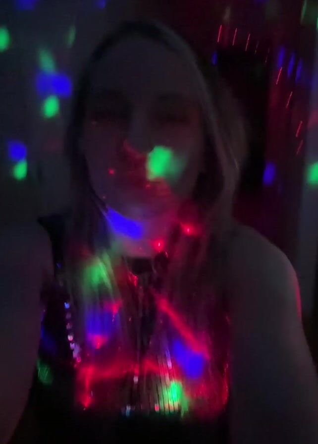 A woman is recording a video of herself under disco lights. The lights are red, green, and blue. She is wearing a black top and necklace. She briefly touches her hair with her hand. The background is dark. Music plays.