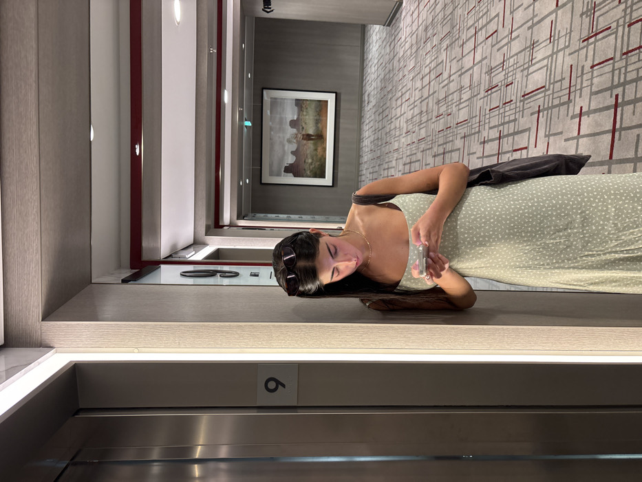 A young woman with long dark hair stands in a hotel hallway on the 9th floor of a building located in San Miguel de Cozumel, Mexico. She is leaning with her right shoulder against a light-colored vertical wall panel that features a thin illuminated strip light on its left edge. She wears a light green spaghetti-strap dress with a small white floral pattern, a gold-colored choker necklace, and dark sunglasses perched on her head. A dark shoulder bag hangs from her left shoulder. Her gaze is directed downwards as she intently operates a white smartphone with both hands. To her immediate left is a closed stainless steel elevator door, next to which a gray plaque displays the number "9". The hallway extends into the background, carpeted with a complex geometric pattern of gray, white, and red lines. The ceiling is white with recessed lighting, bordered by a distinct red horizontal stripe along the upper wall trim. On the far wall in the background, a large framed landscape photograph depicts a desert scene with prominent rock formations and a lone figure. Further down the hallway on the right, a sign with an arrow pointing right is partially visible.