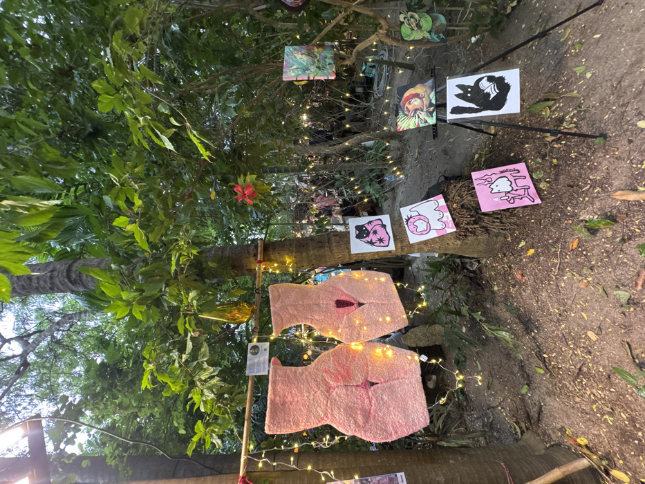 The scene depicts an outdoor art exhibition or gathering in a tropical, heavily vegetated area within Moo 1, Thailand, observed during what appears to be evening or dusk. Numerous warm-toned string lights are draped throughout the environment, illuminating the space and various artworks. In the foreground, two large, light pink, textile-based sculptures are prominently displayed, suspended from a horizontal bamboo pole secured between two tree trunks. The sculpture on the left depicts human buttocks, while the sculpture on the right depicts the vulva. Both are internally illuminated by string lights, casting a soft glow. Small, white informational cards are attached near these sculptures. To the right, a central tree trunk hosts three smaller, square artworks. From top to bottom, these depict: a black cat with pink stars on a white background, a white creature with pink ears/horns and pink stripes on a white background, and a pink creature holding a lit candle on a darker pink background. Further right, a black tripod easel supports two additional artworks: a colorful, stylized painting of a face amidst green foliage, and a black, dog-like figure holding a book on a white background. The ground consists of bare earth covered with scattered leaves and small plant debris. The background is dense with various tree trunks, including what appear to be palm trees, and lush green foliage. Additional string lights are visible extending into the background, where multiple indistinct human figures are discernible, suggesting a social gathering or event. A golden, teardrop-shaped decorative object hangs from a tree branch in the upper center, and a red flower is visible on a branch to its right.