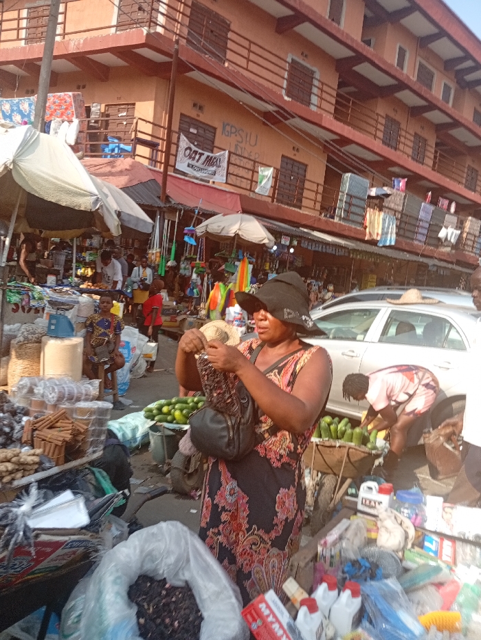 A bustling outdoor market scene shows a woman with a black hat, wearing a patterned dress and a black backpack, handling a purse. Various items are displayed on tables, including spices, cucumbers, and bags of goods. Behind her, people are milling about, and a car is parked nearby. Buildings with multiple floors and balconies line the background. Laundry is hanging from some of the balconies. Signs are visible on the buildings.