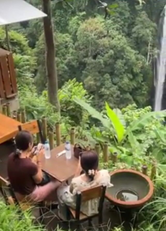 tranquil outdoor cafe setting overlooking a lush, green landscape featuring a stunning waterfall. Two women are seated at a wooden table, which is decorated with two water bottles, bamboo accents and a decorative bowl. One woman is wearing a brown top and pink pants, while the other has a light-colored top with a hair tie. They are engaged in a discussion or simply enjoying the view. The focal point of the scene is the majestic waterfall with multiple streams of water cascading down a verdant, tree-covered hillside. The trees appear to be in a tropical or subtropical location with dense vegetation. The overall atmosphere is peaceful and serene.
