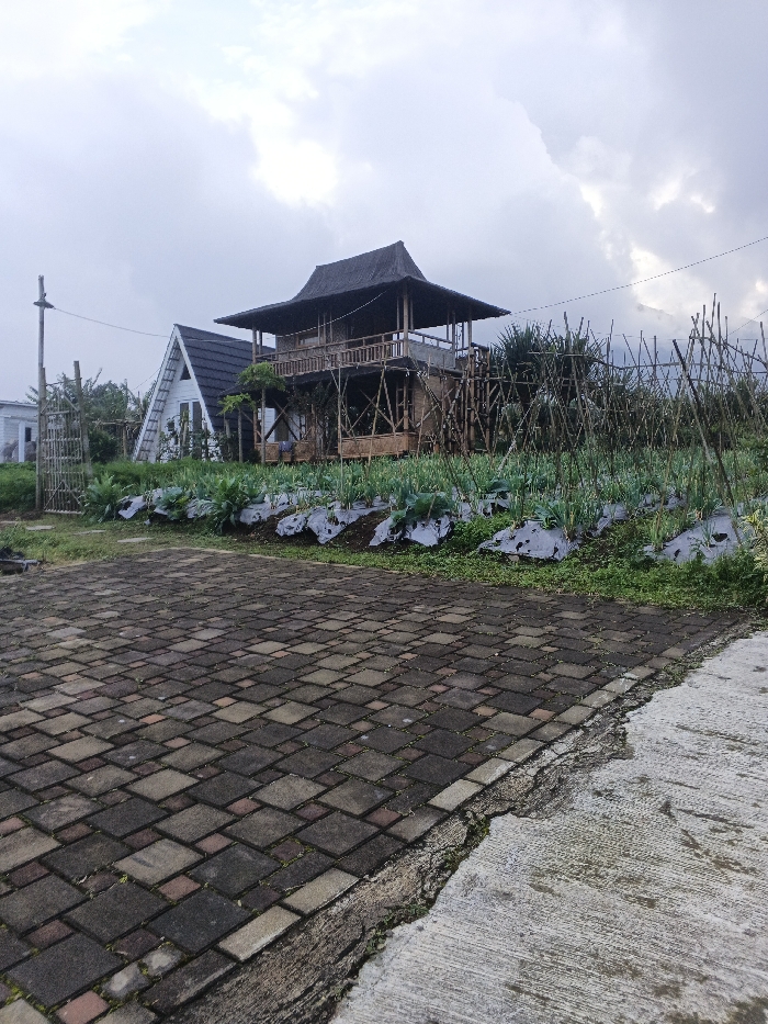 The image depicts an outdoor scene in Sarandi de Cuadra, Uruguay, under an overcast sky. In the foreground, a multi-toned paver driveway or patio, composed of rectangular and square blocks in shades of grey, brown, and reddish tones, extends from the left, bordering a cracked concrete slab on the right. Directly beyond the paved area, a cultivated garden features rows of green leafy plants, some with white plastic sheeting at their bases, alongside rows of taller green stalks. To the right of the garden, a dense arrangement of vertical bamboo poles or stakes forms a trellis-like support structure. In the mid-background, a prominent two-story structure with traditional Southeast Asian architectural elements is situated, featuring a dark, multi-tiered roof with upward-curving eaves and an open-air balcony on its upper level, supported by an exposed bamboo framework. To its left, a white A-frame house with a dark roof is visible, with a white ladder leaning against its left side. A partial view of a smaller white building and a utility pole are visible further to the left. No individuals or specific actions are depicted.
