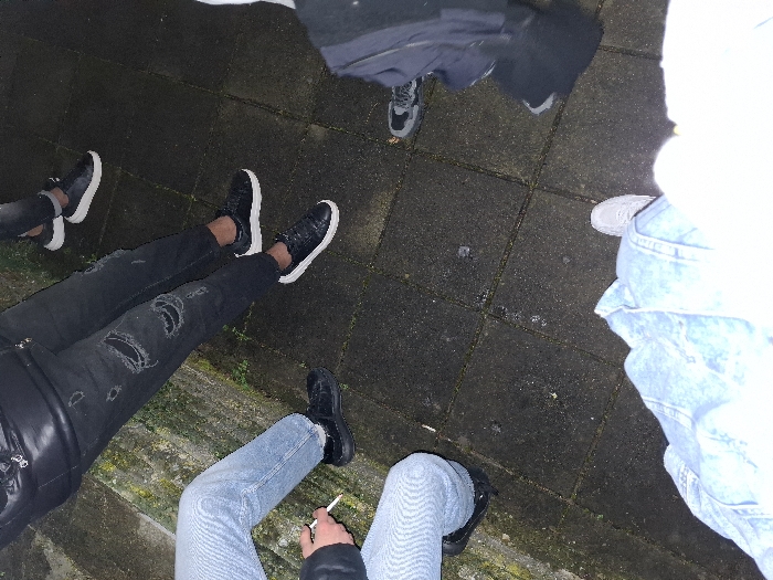 The image displays a ground-level perspective of the lower extremities of at least five individuals gathered on a paved outdoor surface