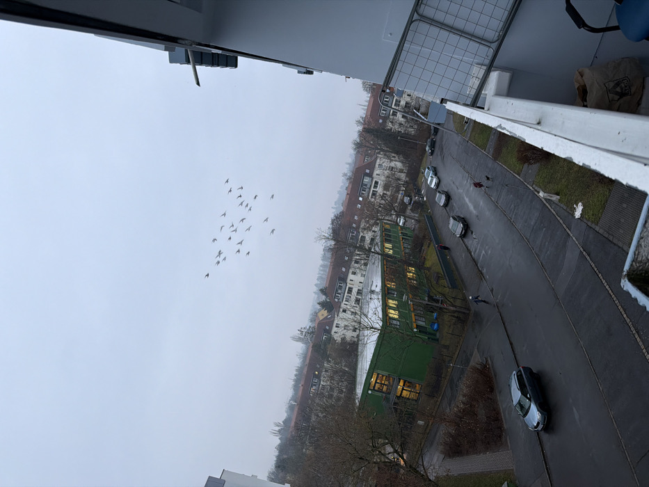 From an elevated perspective, a cloudy sky hosts a flock of birds. Below, a street lined with parked cars runs between apartment buildings and trees. A green building stands out, its windows illuminated. The scene is framed by the edge of a balcony, complete with a wire mesh railing and a sack. The overcast conditions lend a muted palette to the urban landscape.