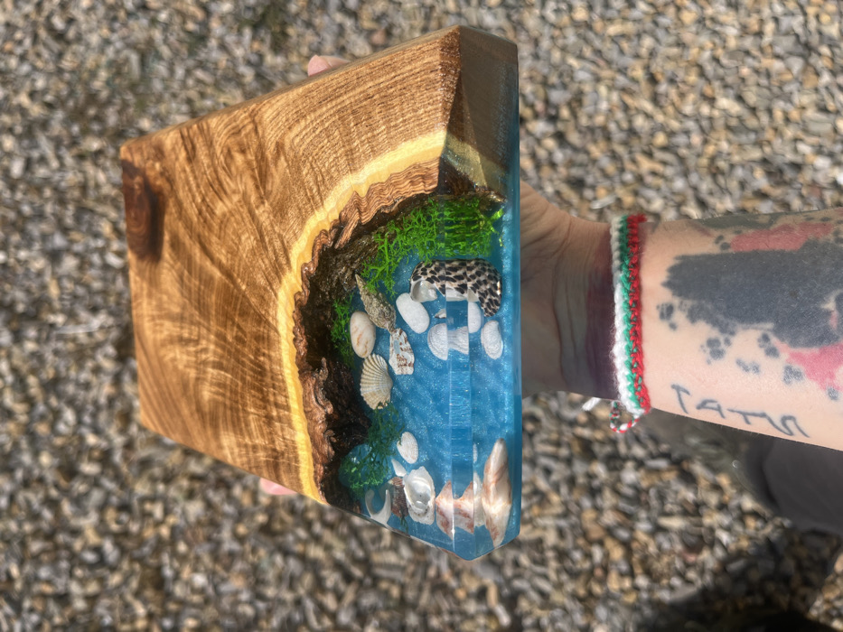 A person, located in Kostinbrod, Bulgaria, is holding a rectangular art piece crafted from polished wood and blue epoxy resin