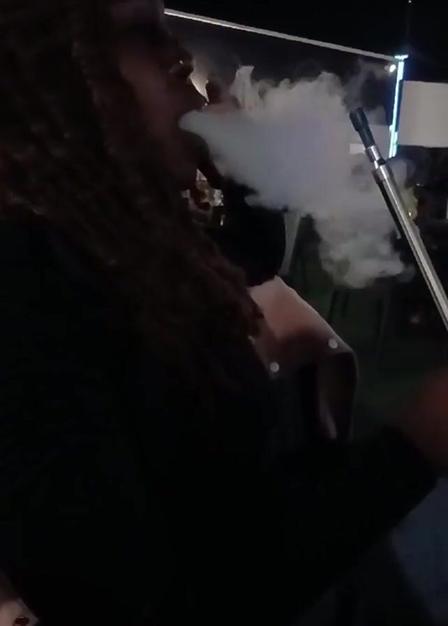 A woman with dreadlocks is sitting and smoking a hookah, exhaling a large cloud of smoke