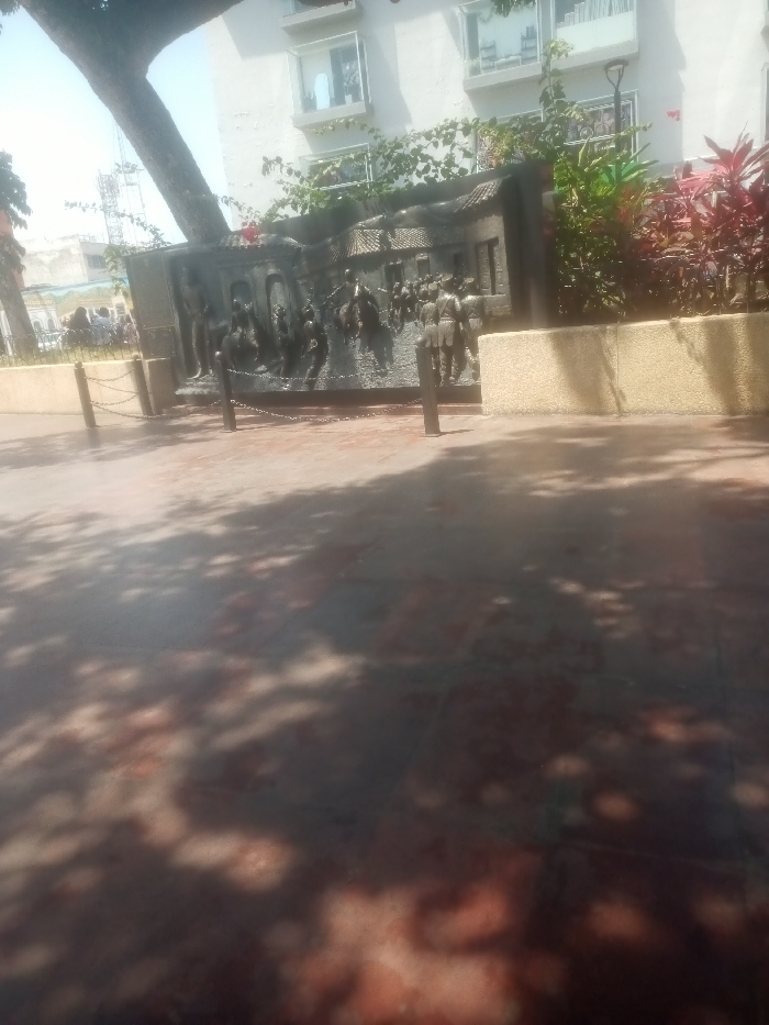 The image displays a historical bas-relief monument situated in Plaza Bolívar, Valencia, Venezuela