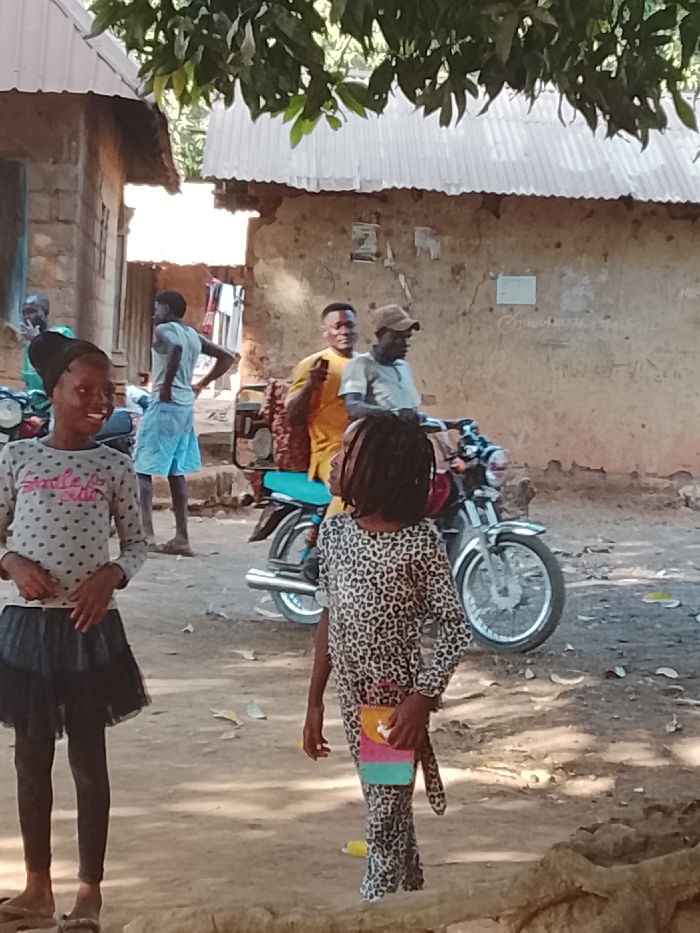 An outdoor scene in Akwanga, Nigeria, depicts five individuals and two motorcycles amidst a backdrop of residential structures