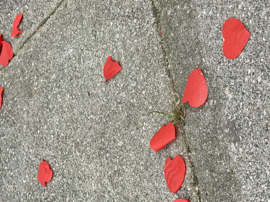 The image displays a close-up, high-angle view of a textured grey concrete ground in Buñol, Spain. Scattered across the surface are approximately 15-20 small, vibrantly red objects. Most of these objects are irregular in shape, consistent with crumpled or folded artificial petals, possibly made of fabric or paper. One distinct object in the lower right quadrant is a flat, perfectly heart-shaped red cutout. The concrete shows visible cracks and seams, with small clusters of green grass growing out from these fissures, notably near the center of the frame. The scene is static, devoid of human presence or active interactions.