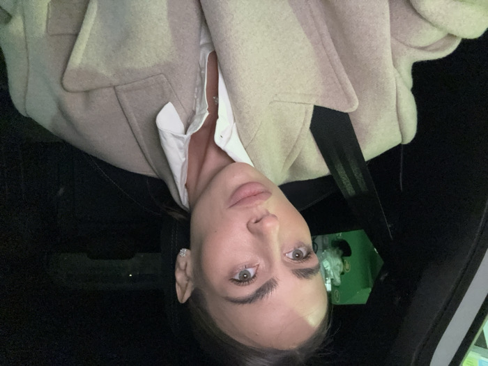 A woman with brown hair and green eyes is pictured from a low angle, wearing a light-colored coat and a white shirt. She has on a seatbelt and appears to be sitting in a car. Her face is the primary focus, with a neutral expression. An earring is visible on her left ear. A green container is visible in the background.