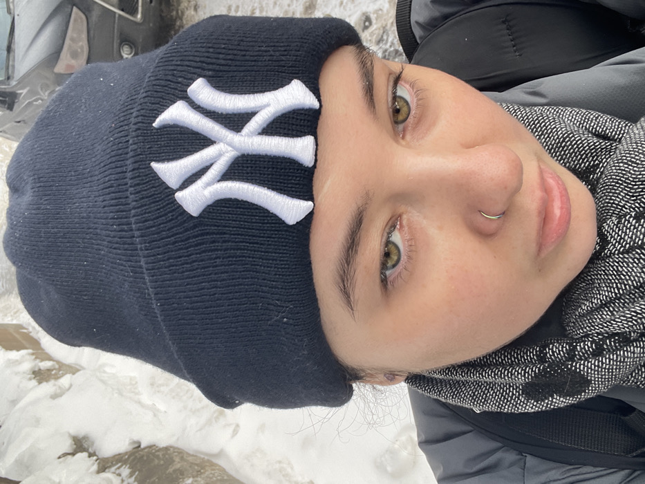 A close-up photograph depicts a person outdoors in a winter environment. The individual, appearing female, wears a navy blue knit beanie adorned with a white embroidered New York Yankees "NY" logo. The subject has green-hazel eyes, a light to medium skin tone with flushed cheeks, and a small silver hoop piercing in the left nostril. They are dressed in a dark grey puffer jacket and a black and white patterned scarf. The subject gazes directly into the camera. The background reveals snow-covered ground, indicating a winter street or path, flanked by snowbanks. A dark colored sedan is partially visible in the upper right quadrant, parked on a snowy surface. The scene is located in Khimki, Russia.