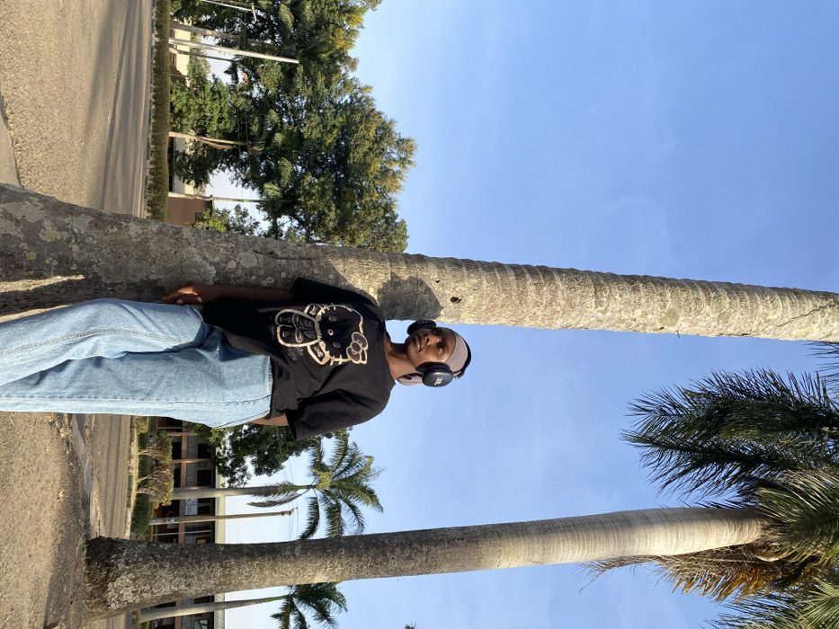 A female subject stands outdoors in Vom, Nigeria, positioned centrally, leaning against the trunk of a large palm tree that dominates the right foreground. She wears a light grey head covering, a black short-sleeved t-shirt featuring a white Hello Kitty graphic on the chest, and light blue denim jeans. Black over-ear headphones, branded JBL, are worn over her head covering. Her head is tilted slightly upward, and her gaze is directed towards the upper right. The scene is illuminated by bright sunlight, casting distinct shadows from the subject and the tree. The background features a clear blue sky, additional palm trees, and dense green foliage from other trees and bushes. A paved road with a visible curb runs horizontally in the mid-ground, behind which distant buildings are partially visible.