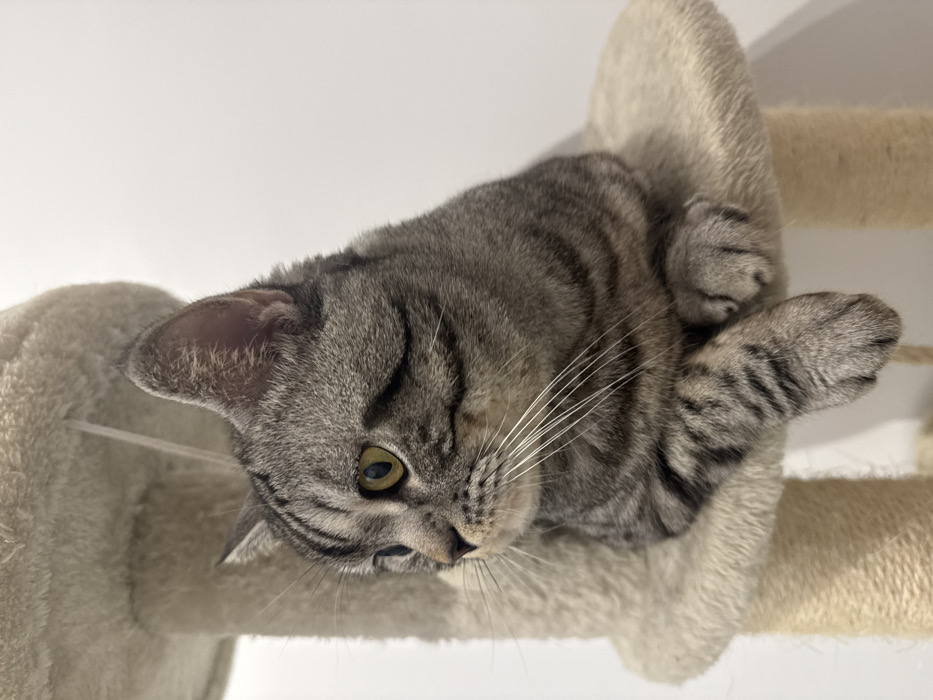 - "One domestic cat is depicted sitting on an elevated, beige-carpeted platform of a cat tree" by FM-rMis83, licensed under CC BY 4.0