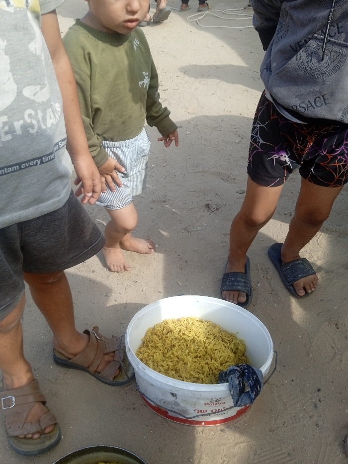 The image depicts three individuals standing on sandy ground in Al-Mawasi, Unknown. In the foreground, a white plastic bucket with a red stripe and Hebrew text (including "Poliva" and "תשלום תשלום") is filled with yellow cooked rice or vermicelli. A dark blue fabric is tucked into the side of the bucket. A portion of a metal pot containing similar yellow food is visible at the bottom left. From left to right, a person's lower torso and legs are visible, wearing a grey t-shirt with partial text "ErSta" and "mtam every time," dark shorts, and brown leather sandals. Next to them, a young child stands barefoot, wearing an olive green long-sleeved shirt and light blue and white striped shorts, holding the hand of the individual on the left. The child looks slightly to the right. On the far right, another person's lower torso and legs are visible, wearing a grey hooded top with "VERSACE" text, black shorts with a white spiderweb and purple spider design, and black Adidas slide sandals. In the background, other indistinct figures' feet and legs are partially visible, along with a white rope lying on the ground. The scene is illuminated by strong daylight, casting visible shadows.