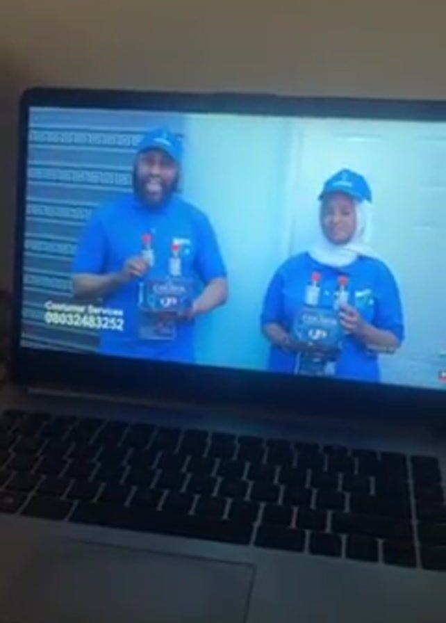 A person is filming a laptop screen that is displaying a commercial for a product called Coldfix. Two people, a man and a woman, both wearing blue shirts and hats, are standing in front of a white wall with a patterned border. They each hold a bottle of Coldfix and a box. The man is speaking and gesturing with the bottle. The laptop's keyboard and trackpad are visible in the foreground. A customer service phone number is displayed on the screen.
