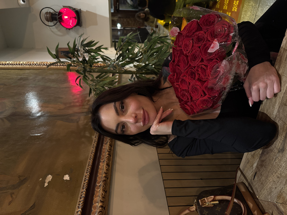 - "A woman with long dark hair holds a large bouquet of red roses wrapped in clear plastic" by FM-4WEif2, licensed under CC BY 4.0
