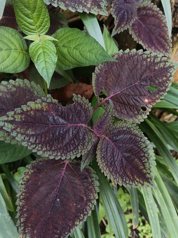A detailed close-up image displays a collection of plant foliage in the city of Unknown, Vietnam. The prominent subjects are several large, ovate leaves featuring a primary dark purple coloration with distinct green, serrated edges and visible green venation. Several of these leaves exhibit small, irregular perforations. Surrounding and partially obscured by these are additional bright green leaves, including smaller, newer growth at the top and elongated, narrow, grass-like blades. No individuals, actions, or interactions are present in the frame. The setting is an outdoor, vegetated environment under natural illumination.